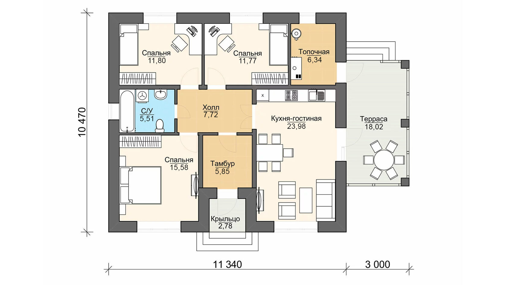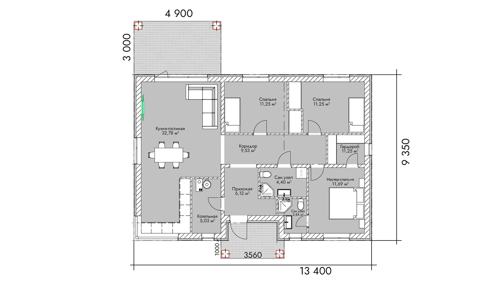 3 просторные спальни. При необходимости можно передвинуть внутреннюю несущую стену, чуть уменьшив спальни и увеличив другие помещения.